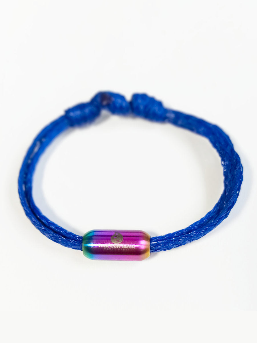 Das Viva con Agua x BRACENET Armband, hergestellt aus einem ehemaligen Fischernetz aus Irland! Das Armband ist größenverstellbar und in der Farbe Dunkelblau mit Tube in Regenbogenfarben erhältlich.